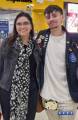 Foto com duas pessoas: uma jovem mulher sorridente de cabelos longos castanhos, usando óculos, vestindo roupa escura com jaqueta jeans e um lenço escuro de estrelinhas brancas no pescoço. A seu lado direito um jovem de cabelo escuro, usando camiseta branca e o blazer marinho com bottons característicos dos intercambistas. Eles provavelmente estão em um saguão de aeroporto. Abaixo no canto direito da foto temos uma malinha bege com as palavras em branco ao lado: rotary youth exchange e abaixo quatro quadradinhos azuis com os números 4480 em branco.