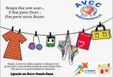No canto superior direto a logo da AVCC Fernandopolis (duas mãos juntas segurando um coração vermelho). No centro do card da esquerda para a direita temos um varal fino preto com as peças penduradas: vestido, uma tiara, um boneco, um par de tênis, um livro e uma bolsa.