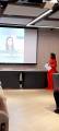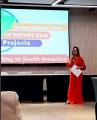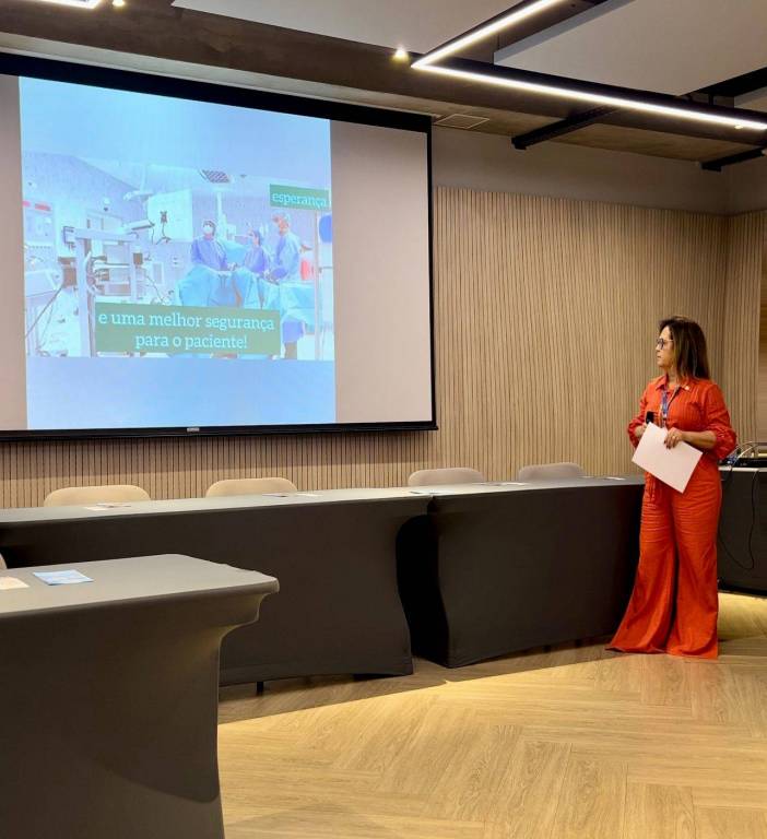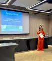 Foto de uma apresentação feita em palestra por uma jovem senhora de cabelos longos castanho, usando óculos e roupa vermelha. Ela segura um microfone com a mão direita e uma folha branca com a esquerda. A seu lado esquerdo um grande telão trás algumas informações: