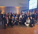 Foto com várias pessoas entre homens de terno escuro e mulheres elegantemente vestidos. A maioria está de pé mas temos alguns na frente que estão agachados. Todos usam crachá no pescoço. Eles estão em um lugar aparentemente fechado e observamos na lateral direita muitas bandeiras posicionadas em seus suportes lado a lado. Acima delas um grande telão aceso. Atrás paredes claras com focos de luz . O piso é amadeirado.