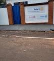 A imagem mostra a fachada de um edifício com um muro de tijolos à vista e um portão de metal pintado de azul. O muro é composto por três pilares de tijolos, com o portão localizado entre o primeiro e o segundo pilar à esquerda. Acima do muro, há arame farpado. No muro, há três placas retangulares.