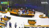 Ao fundo a parede é toda adornada com canaletas metálicas e na lateral esquerda observamos duas bandeiras do Brasil e no meio delas uma placa verde em letras brancas: Câmara dos Deputados.
