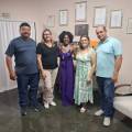 Foto com cinco pessoas lado a lado, da esquerda para a direita temos: um homem de cabelos pretos e bigode vestindo calça jeans e camiseta escura, uma mulher loira usando óculos de calça clara e blusa preta, uma mulher de cabelos escuros vestindo vestido longo roxo, uma mulher loira de vestido estampado usando óculos e finalizando na direita um homem semi calvo de calaça jeans e camiseta polo azul clara. Todos estão sorrindo discretamente. Eles estão em local fechado com paredes claras ao fundo com vários quadros nela. Na lateral esquerda observamos uma cortina branca longa na parede. Na direita parte de uma poltrona clara. O piso é escuro.