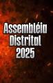 Card com fundo vermelho vibrante indo para o preto na direita lembrando labaredas de fogo e trás no centro em letras grandes prateadas a mensagem "Assembleia Distrital 2025.
