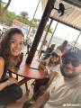 Quatro pessoas sorridentes posam juntas para uma foto em frente a uma estrutura de madeira que anuncia o "1º Torneio Beneficente de Beach Tennis do Kazu". A estrutura tem palavras como "Amigos", "Felicidade", "Amor" e "Paz" escritas em pequenas placas de madeira à esquerda. As pessoas parecem estar felizes e animadas.