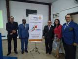 O salão tem paredes brancas e um teto com iluminação fluorescente. Há algumas mesas e cadeiras vazias na frente do grupo, sugerindo que eles podem ter acabado de participar de um evento. Na parede à direita, há um painel com o logo do Rotary International.