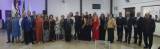 Um grupo grande de pessoas está posando para uma foto em um salão bem iluminado. Há aproximadamente 25 adultos, homens e mulheres, todos vestidos de forma formal. Os homens em sua maioria vestem ternos escuros com camisas claras e gravatas, enquanto as mulheres usam vestidos de diferentes estilos e cores.