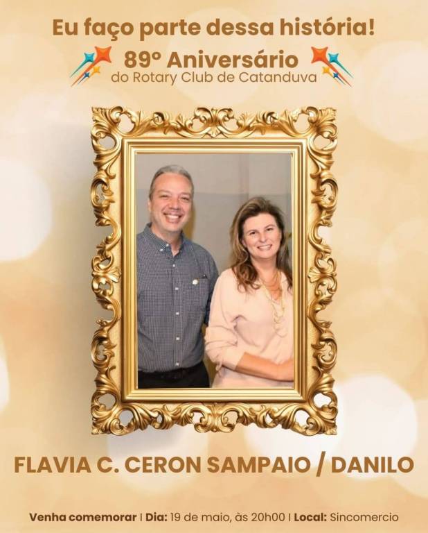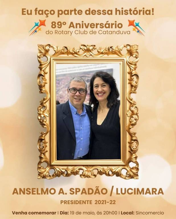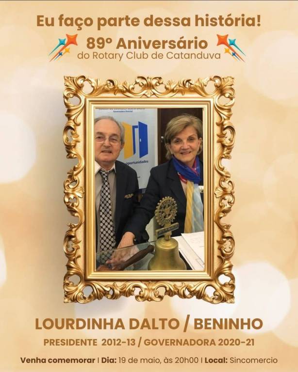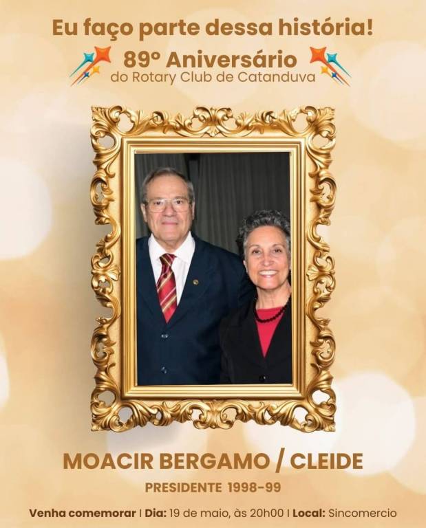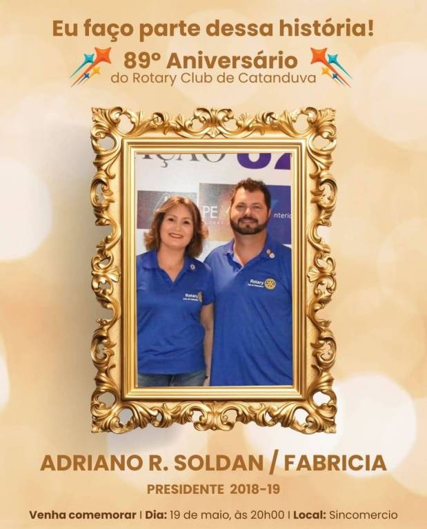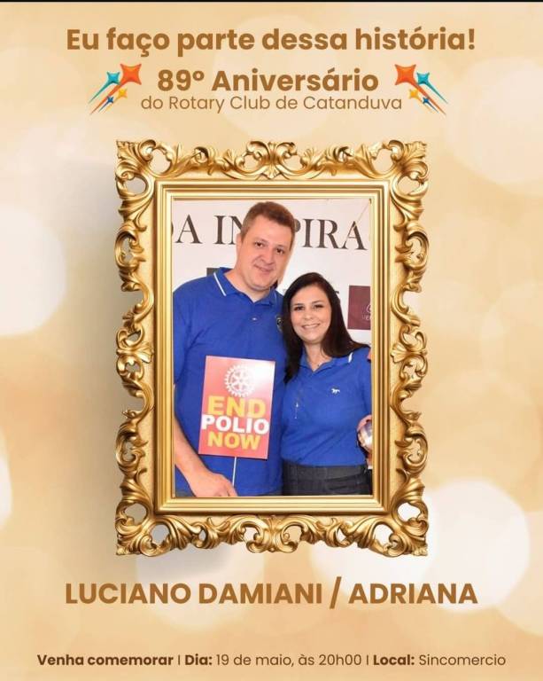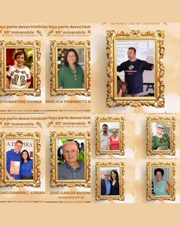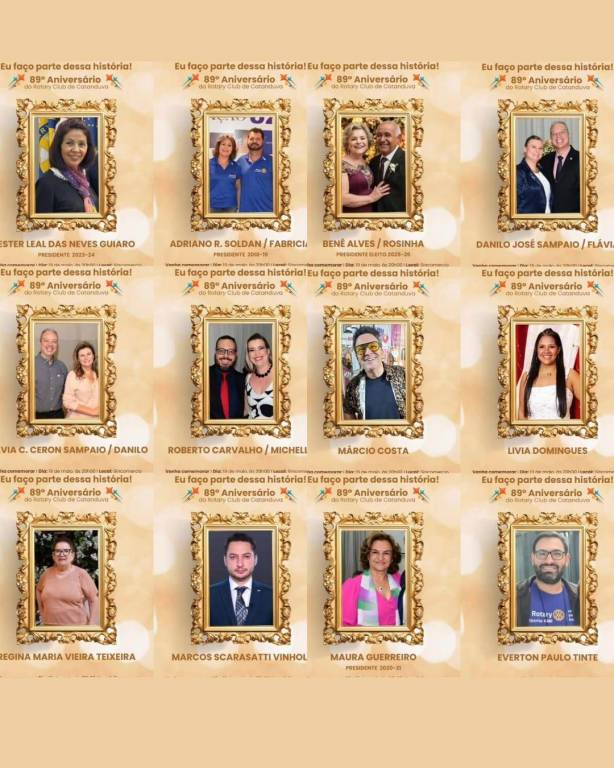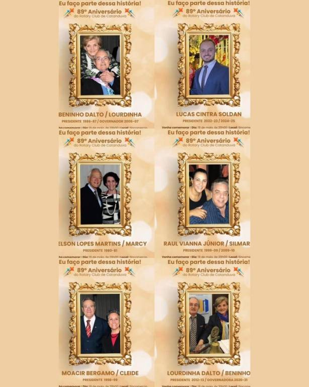 Em todas as fotos, acima da identificação dos casais, há a frase "Eu faço parte dessa história!" e abaixo, a menção ao "89º Aniversário do Rotary Club de Catanduva".