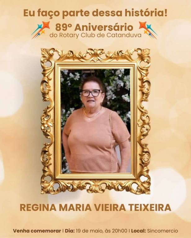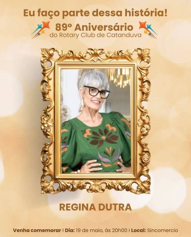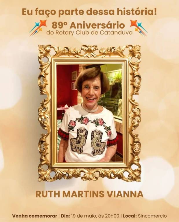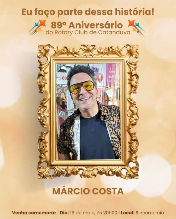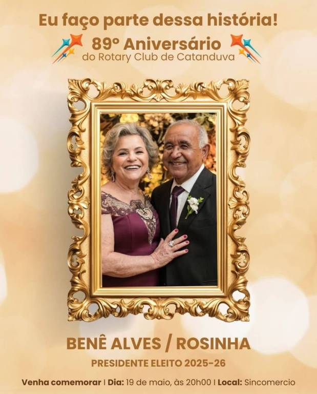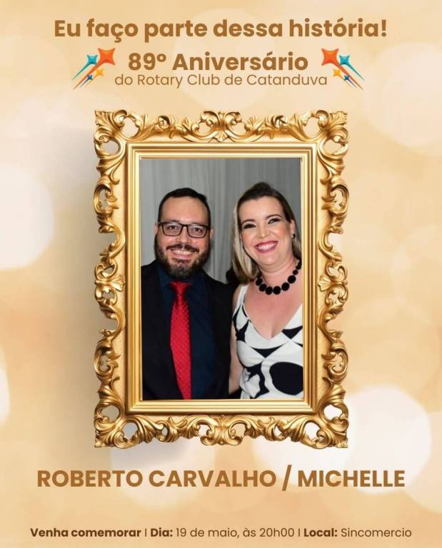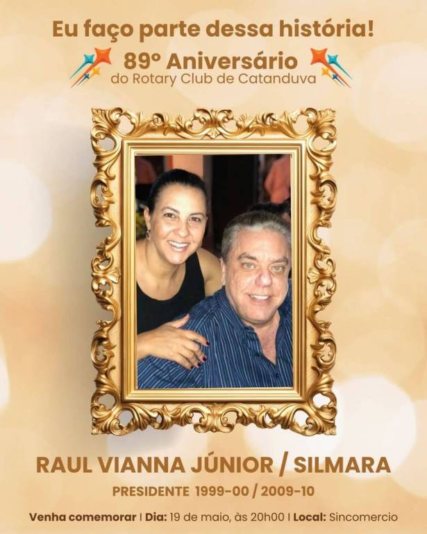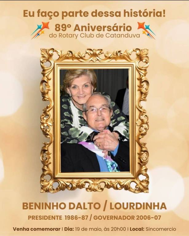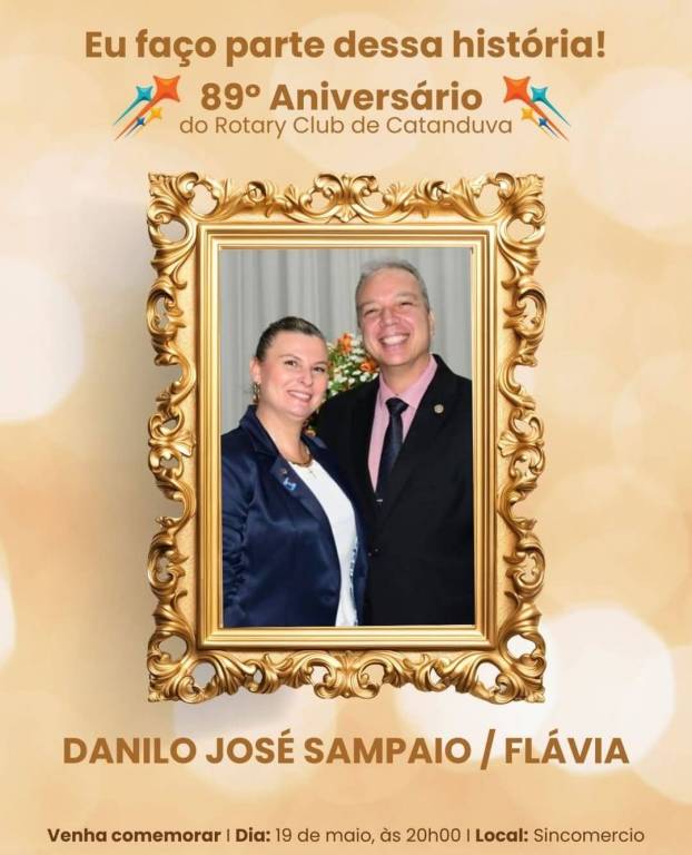 Em todas as fotos, acima da identificação dos casais, há a frase "Eu faço parte dessa história!" e abaixo, a menção ao "89º Aniversário do Rotary Club de Catanduva".