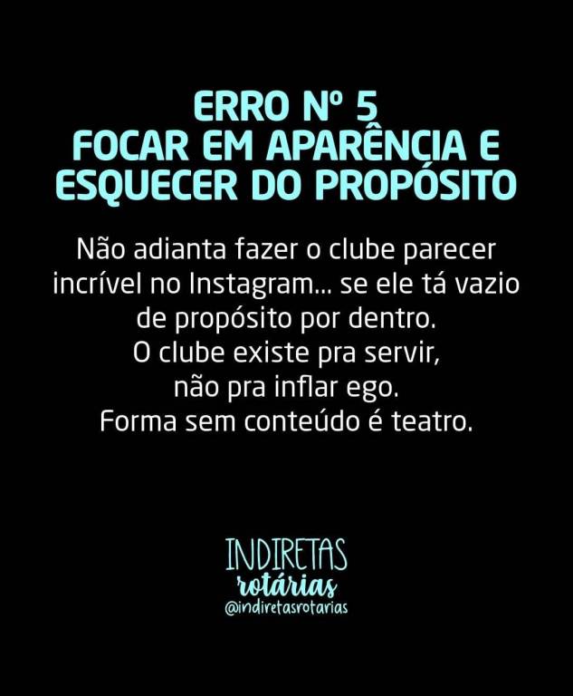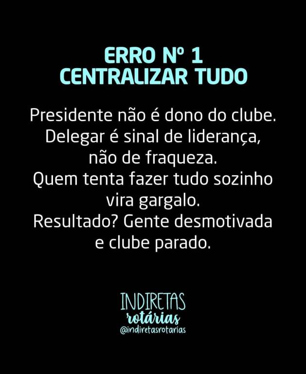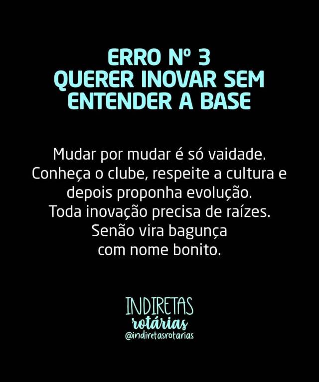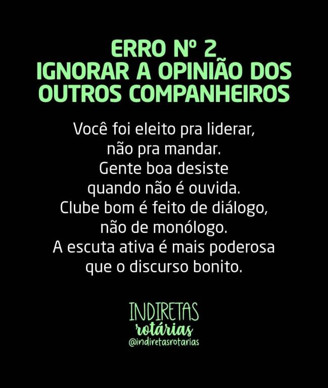 A atmosfera geral da imagem sugere um tema de liderança e erros a serem evitados em um contexto de clube ou organização, possivelmente relacionada ao Rotary Club, dado o termo "rotárias". O design é convidativo e incentiva a interação ("ARRRASTA PRO LADO").