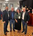 Aqui estão quatro pessoas posando para uma foto em um evento. Dois homens à esquerda vestem ternos escuros, camisas e calças jeans. A mulher ao centro veste uma blusa verde-oliva, uma saia preta e sandálias pretas. O homem à direita veste um blazer preto, uma camisa branca, calças jeans e tênis pretos e brancos. Todos os quatro indivíduos estão sorrindo e olhando para a câmera. Eles parecem estar usando crachás. O chão tem um padrão quadriculado em tons de bege e marrom. Ao fundo, há um palco com cortinas escuras, algumas bandeiras e outras pessoas visíveis.