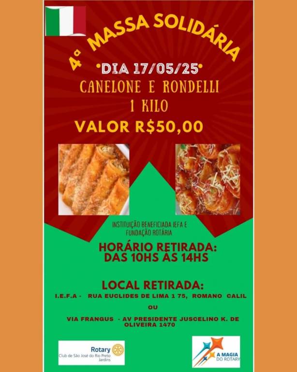 O Rotary Club de São José do Rio Preto - Jardins, através do Pres. Agostinho Donizeti Ferreira, agradece todos os patrocinadores que colaboraram na realização da 4ª massa solidária que será entregue no dia 17/05/25, nos pontos de entrega I.E.F.A. e no Via Frangus em São José do Rio Preto, das 10hs às 14hs.