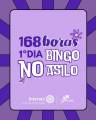 No Primeiro post, o fundo é de listras que variam de roxo claro para roxo escuro, no quadrado ao centro está escrito "168 horas 1º dia: Bingo no Asilo".