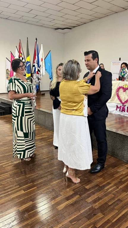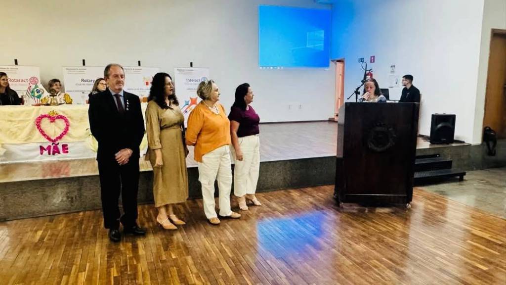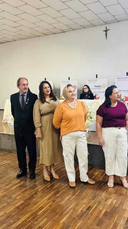 O certificado que a mulher ao centro segura tem uma moldura dourada e um fundo branco com texto em preto e um logotipo colorido na parte superior. A faixa atrás deles é branca com letras grandes em rosa que parecem formar a palavra "Mães" e outros elementos gráficos coloridos, incluindo o que parece ser o logotipo do Rotary Club. O palco atrás deles tem uma superfície escura e lisa e uma parede bege clara com um crucifixo preto pendurado no centro. O chão em frente ao palco é de madeira clara com tábuas dispostas horizontalmente. A iluminação parece vir de cima, projetando sombras suaves sob as pessoas.