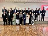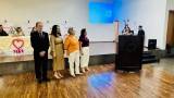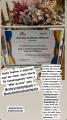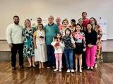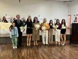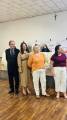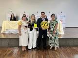 Três pessoas adultas posam em pé em frente a um palco com uma faixa e um crucifixo na parede. A pessoa ao centro, uma mulher de pele clara com cabelos castanhos curtos e ondulados, segura um certificado emoldurado com ambas as mãos. Ela veste uma blusa estampada com flores em tons de rosa, branco e verde, calças compridas pretas e sapatos baixos rosa claro. À sua esquerda, um homem mais velho de pele clara e calvo veste uma camisa polo verde-água, calças jeans azuis e sapatos pretos. À direita da mulher, outra mulher de pele clara com óculos e cabelos castanhos na altura dos ombros usa uma blusa estampada em tons de bege, marrom e amarelo com mangas curtas bufantes, uma saia longa branca e sapatos florais de salto baixo. Ela também usa brincos dourados e pulseiras douradas em ambos os pulsos.