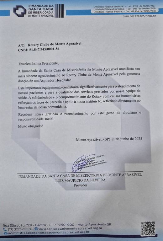 A entrega contou com a presença de representantes do Rotary Club de Monte Aprazível e do Provedor da Santa Casa, Luiz Maurício da Silveirda, que expressou gratidão pelo apoio contínuo da entidade rotária.