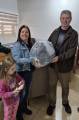 No centro da imagem, entre a menina e o homem corpulento, está uma mulher sorrindo. Ela tem cabelos castanhos escuros e usa uma jaqueta jeans, uma blusa escura por baixo e calças jeans. A mulher segura um objeto embalado em plástico cinza nas mãos, que parece ser um aparelho eletrônico.
