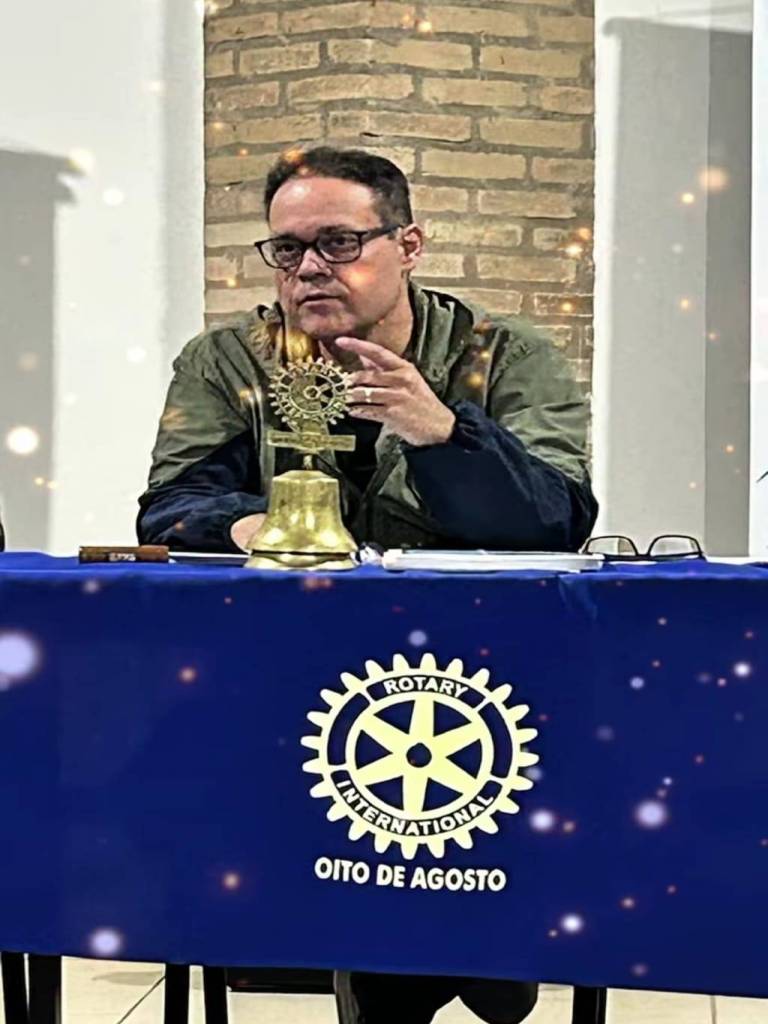 A imagem mostra um homem, que pode ser Marco Valeriani, sentado a uma mesa coberta por um pano azul com o logotipo do "Rotary International - Oito de Agosto". Ele usa óculos e uma jaqueta verde-oliva. Na mesa, há um sino dourado com um emblema do Rotary no topo, além de outros objetos discretos. O fundo parece ser uma parede de tijolos. A imagem tem um efeito de brilhos.
